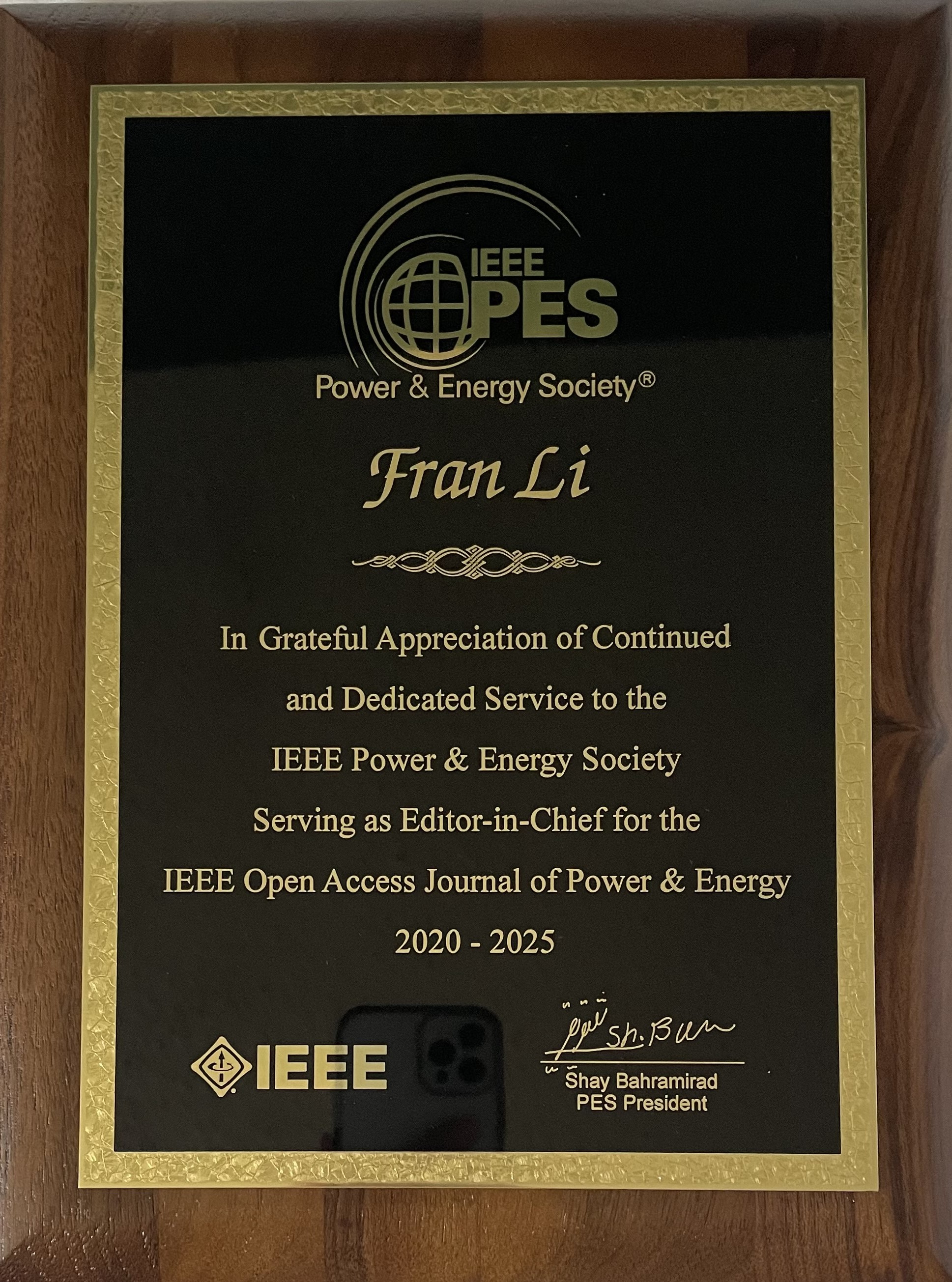 PES Technical Committee Prize Paper Award (as the Corresponding Author and Advisor for the paper entitled "Novel linearized power flow and linearized OPF models for active distribution networks with application in distribution LMP" published in IEEE Trans. on Smart Grid, 2018, which was first-authored by my PHD student Haoyu Yuan) |