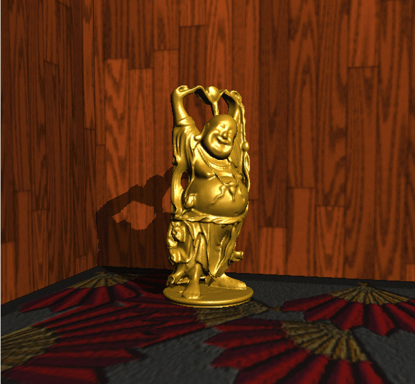 Semi-transparent mirror, with procedural textured floor, marble textured Budda, and a ball mapped with both a color texture and a texture of specular high-lights. (created by Lana Mironova)