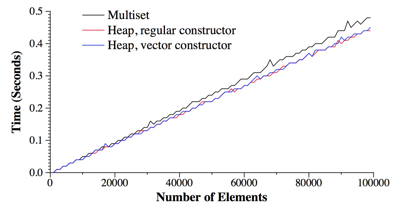 If we think about running time complexity, obviously the depth of a heap with n elements is log2(n). Thus, Push() and Pop() both run with O(log(n)) complexity. This is the exact same as using a multiset above. So why do we bother?