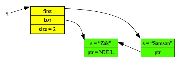 Part B: To push, you have to do two things, depending on the current size of the queue. If it is zero, then simply create a one-element queue whose first and last pointers point to the only node. Otherwise, you allocate a new node, and have the last element point to it. In either case, you update the size: