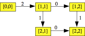 UNIX> a.out 0 On node [0,0] Considering Class 0: [1,1] Pushing [1,1] from [0,0] - path length 1 On node [1,1] Path found: Length = 1 UNIX> a.out 1 On node [0,0] Considering Class 0: [1,2] Considering Class 1: [2,1] Considering Class 2: [1,1] Pushing [1,1] from [0,0] - path length 1 On node [1,1] Considering Class 0: [1,2] Pushing [1,2] from [1,1] - path length 2 Considering Class 1: [2,1] Pushing [2,1] from [1,1] - path length 2 Considering Class 2: [1,1] On node [1,2] Considering Class 0: [1,2] Considering Class 1: [2,1] Pushing [2,2] from [1,2] - path length 3 Considering Class 2: [1,1] On node [2,1] Considering Class 0: [1,2] Considering Class 1: [2,1] Considering Class 2: [1,1] On node [2,2] Path found: Length = 3 UNIX> a.out 2 | tail -n 1 Path found: Length = 3 /* This is right because I'm ignoring expiration. */ UNIX> a.out 3 | tail -n 1 Path found: Length = 3 UNIX> a.out 4 | tail -n 1 Path found: Length = 7 UNIX> a.out 5 | tail -n 1 Path found: Length = 2 UNIX>Next, I add expiration. That kills example 2: