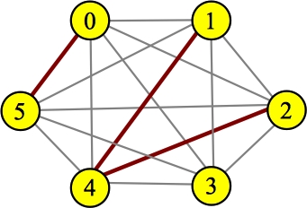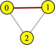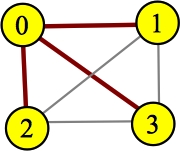 UNIX> cp Hamilton-1.cpp HamiltonPath.cpp UNIX> g++ Hamilton-Main.cpp UNIX> a.out 0 1 UNIX> a.out 1 0 UNIX> a.out 2 0 UNIX> a.out 3 1 UNIX>At this point, we have to figure out how to count the paths. Let's consider examples. I'm only drawing the red edges now. Here's a pretty simple example:
