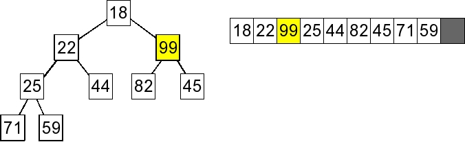 ![]() 3. Percolate Down: Since 18 is the min child, swap 18 and 99. |