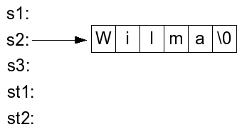 Now, the line "st1 = s2" makes a copy of "Wilma", and the line "st2 = st1" makes another copy of "Wilma". The next two lines set individual characters of each of these copies. Here's the state of the variables: