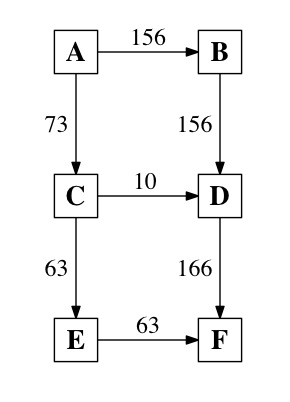 Part 3: Greedy DFS: If we do a depth-first search where we always use the maximum capacity edge from a node, the first path will be ADHFI with a flow of 38. The next path will be ABCFI with a flow limited by edge FI, whose capacity is now 68. Thus, the answer is u.