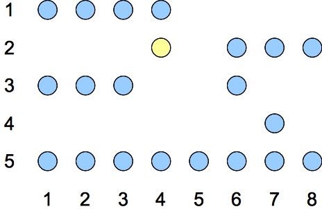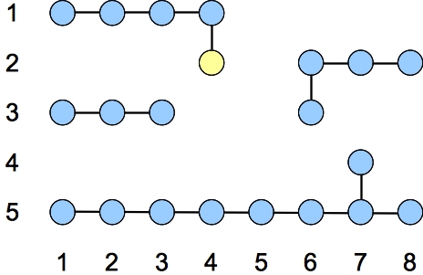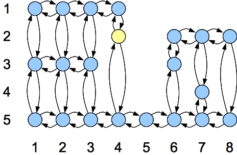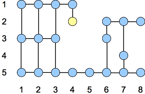 Now, add all edges of size 1, and for each of these, determine connected components with disjoint sets. You can treat the graph as undirected this time. Each time you add an edge, you test to see if it connects nodes in different disjoint sets. If so, you perform Union. When you are done with the edges of size 1, you see if the starting node and the coin node are in the same disjoint set. Here's the graph after adding the edges of size 1: