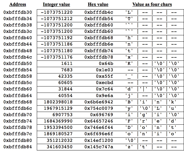 For example, the four bytes starting at address 0xbfffdb30 are equal to -1073751220 when represented as an integer. They are equal to 0xbfffdb4c when represented as hexadecimal. The byte at 0xbfffdb30 is equal to the 'L' character. The bytes at 0xbfffdb31, 0xbfffdb32 and 0xbfffdb33 are all non-printable characters.