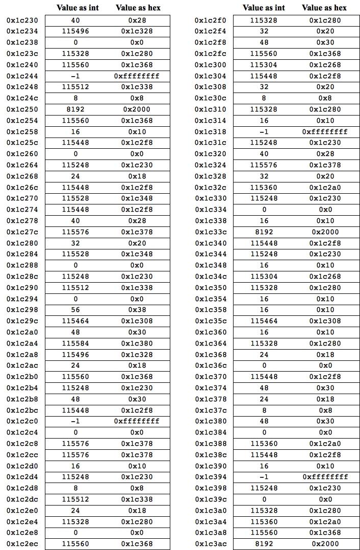 Question 4Suppose your heap is composed of 384 bytes starting at address 0x1c230, pictured on the right. You are given the following assumptions: