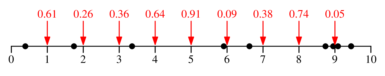 UNIX> sh -c '(for i in 1 2 3 4 5 6 7 8 9 4.633579 ; do echo $i; done ) | bin/points_stdin txt/1d_10.txt' 0.610897 0.258711 0.358142 0.641858 0.909016 0.0909843 0.377571 0.737174 0.047352 1.27544 UNIX>Here are five more data files: