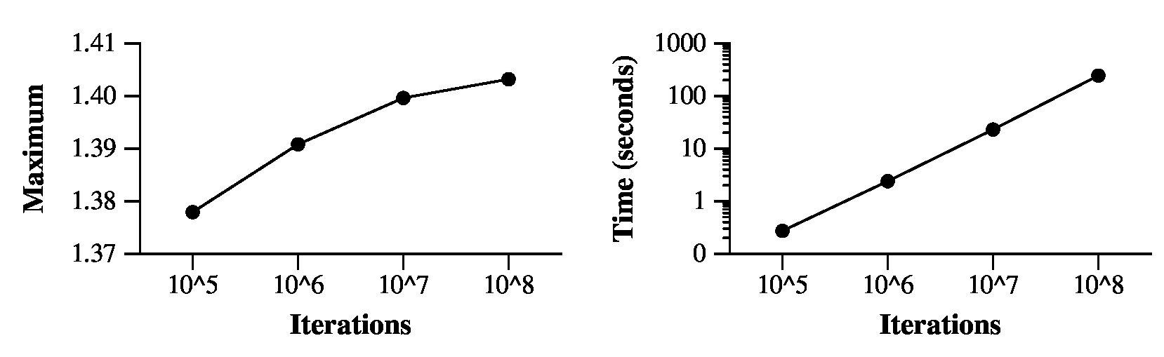 Now we can estimate the maximum point for each of the data sets. The amount of time, and the precision of the search depend on the data set. That tiny 1D dataset takes a blink of an eye, and the 2D data sets don't take long: