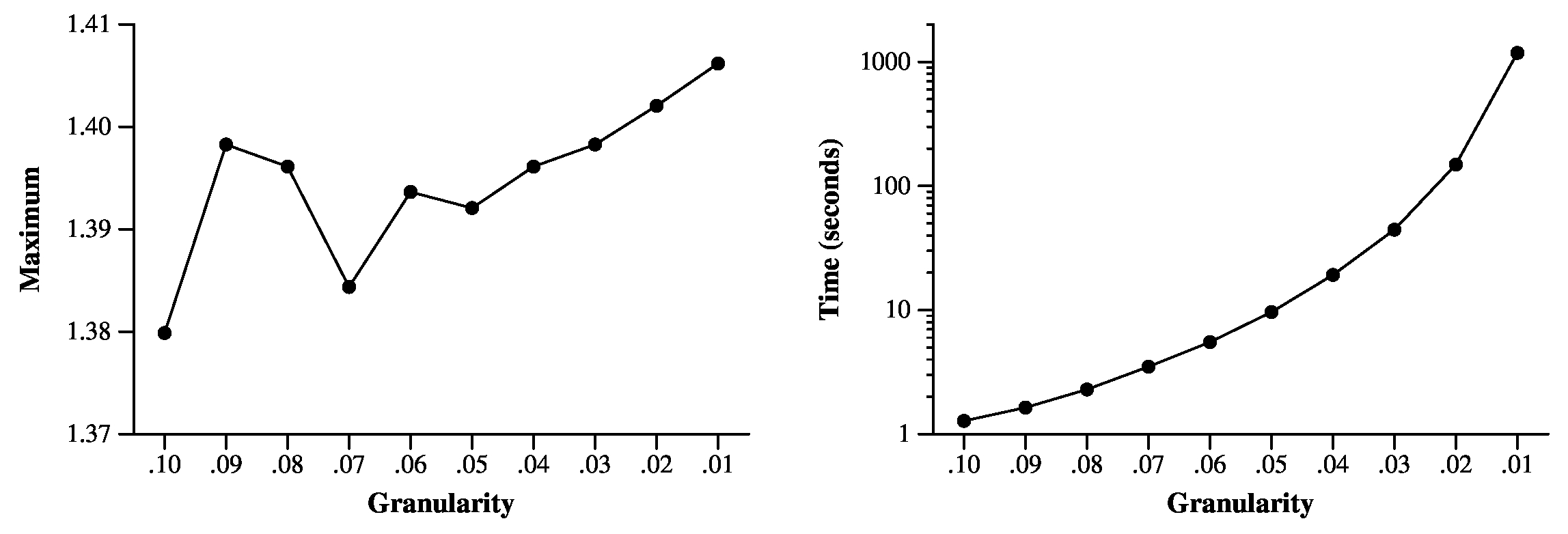 I've colored those values in red, because they are troublesome -- first, you'll note that two of the the points for 0.8 are more than 0.1 units away from the points for 0.9. That's what I mean by the lower granularities not "refining" the higher granularities. Worse, the maximum for a granularity of 0.8 is lower than the granularity for 0.9. Here are the maxima and timings for all granularities from 0.10 down to 0.01: