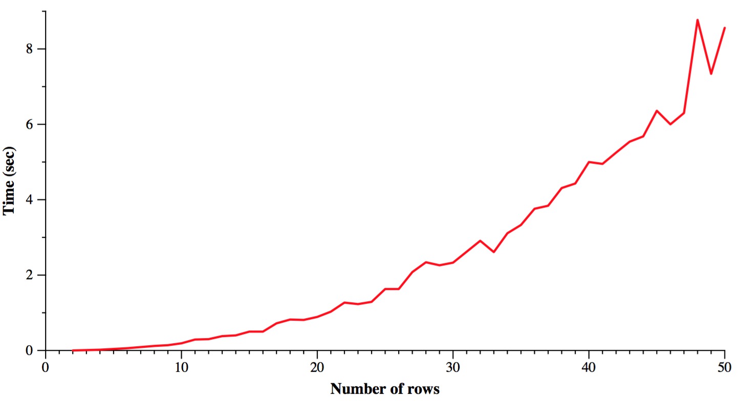 Finally, let's time it. The following graph varies the number of rows from 2 to 50, while keeping the number of columns constant at 100. I only ran each test once, so you'll get some jagged lines. Plus I used a different seed for each test, so there's another source of variability. The machine is the Linux box on my desk in my office. You pretty much get what you'd expect: