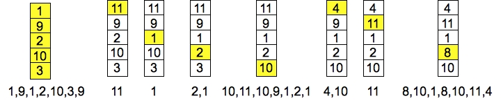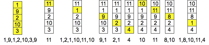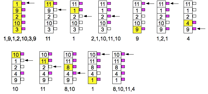 Clock: Now we make use of the "reference" bit and a pointer that treats the frame pool as a circular buffer. When we need a new frame, we start with the pointer and cycle through the buffer until we find a page with an unused reference bit. That is the page that we replace. As we cycle through, we clear the set reference bits. This is depicted below. The answer is f.