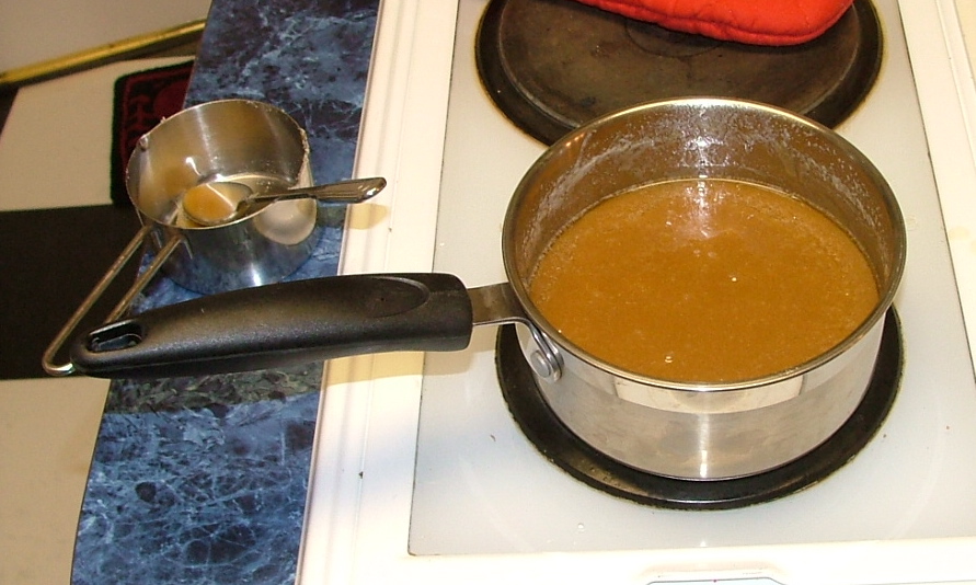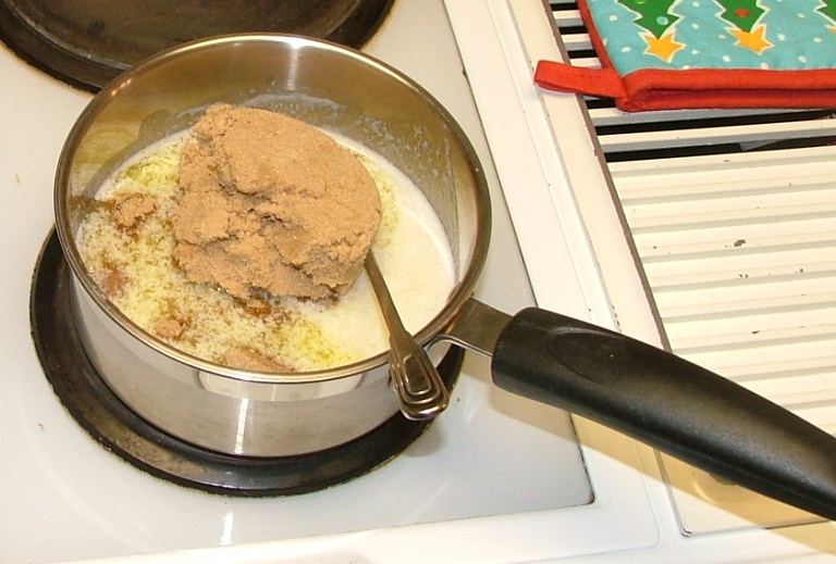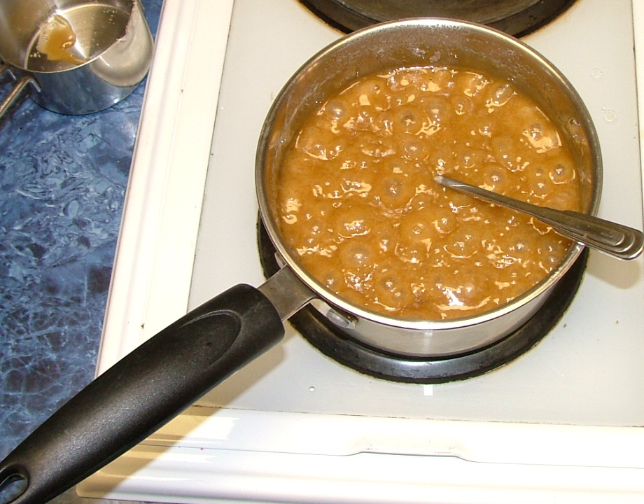 Melt the butter in a saucepan, and add the sugar. Bring it to a boil