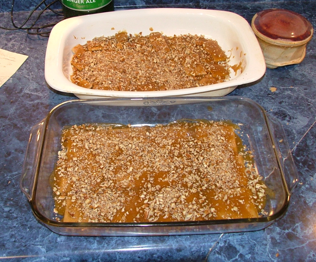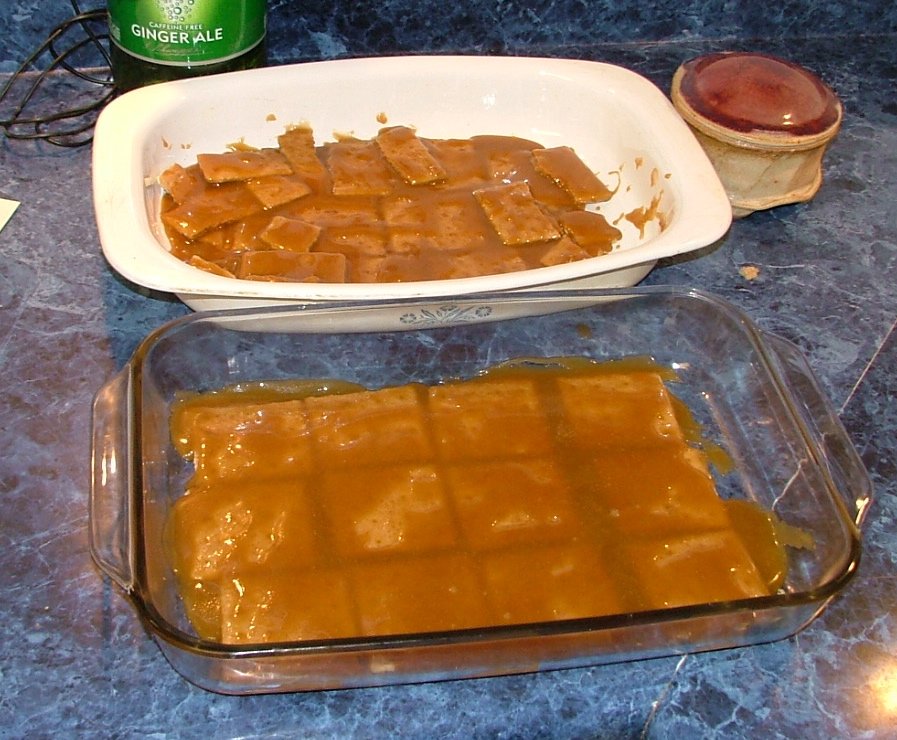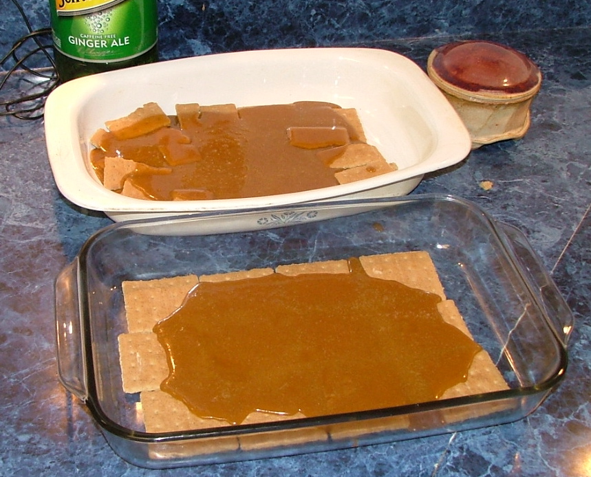 In two 9x11 or 9x13 pans, lay out 12 squares each of graham crackers.
