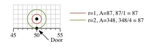 I'm only showing the relevant part of the room. I've drawn two circles around the sensor. The first has a radius of 1, which means that when the intruder's noise level is 87, the sensor can detect the intruder when the intruder is at or within that circle. The second has a radius of 2, which means that when the intruder's noise level is at 348, the sensor can detect the intruder when the intruder is at or within that circle. This is because (A/d2) ≥ 87.