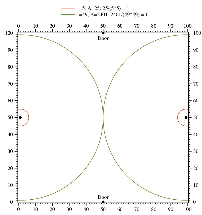 UNIX> cp Alarmed-1.cpp Alarmed.cpp UNIX> g++ Alarmed-Main.cpp UNIX> a.out 0 Enter A: 87 Radius of 0: 1.000000 0: 1: 2: 0 UNIX> a.out 0 Enter A: 348 Radius of 0: 2.000000 0: 1 2 1: 0 2: 0 0 UNIX> a.out 0 Enter A: 347.9999999 Radius of 0: 2.000000 0: 1: 2: 0In example 1, we test the two circles in the drawing -- A=25 and A=2401. In both cases, there are edges from a sensor to a wall, but in the second, there is also an edge between sensors: