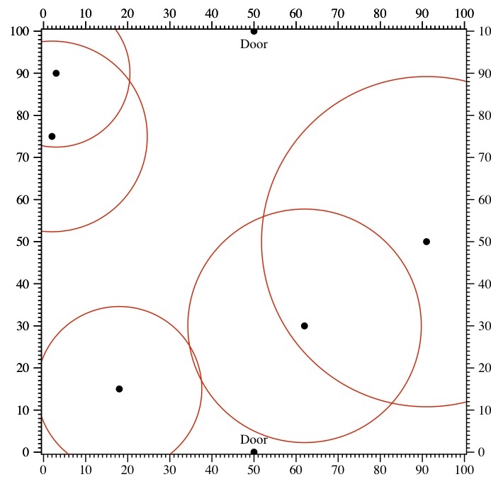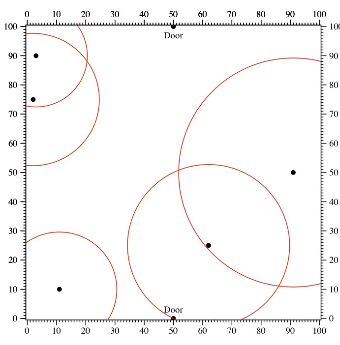 It should be clear from this picture that at this value of A, the intruder cannot pass from one door to another. Those three sensors and the walls make it impossible. Hopefully this example gives you a clue about turning the problem into a graph.
