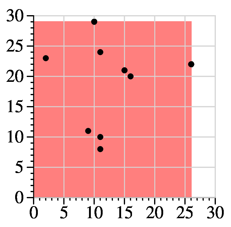 Now, to craft a solution: It should be clear that the bottom-left corner of any solution will have the x value of some point in x and a y value of a point in y. It doesn't have to be the same point. For example, the green square above has a bottom-left point of (10,20), corresponding to the points (10,29) and (16,20). Let's call the bottom-left point (l,b). It should also be clear that if the width of the square is w, then there will be a point whose x value is l+w, or there will be a point whose y value is b+w. That is because there has to be a point on the top or right side of the square. That gives us the brain-dead enumeration: