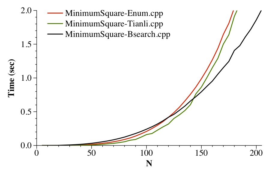 The point at index 3 is 11, which is indeed the minimum width square! It should be pretty clear that making the vector and sorting it is O(N log(N)), which, when combined with the O(N2) of the first two loops makes O(N3log(N)).