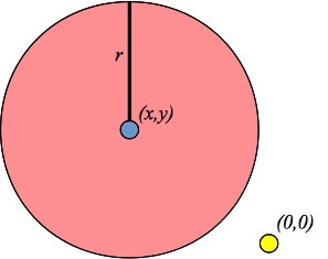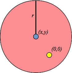Can you see what close is? Can you calculate far as a function of x, y and r? Now, here is a drawing where the city does not contain the radio tower: