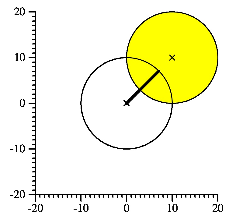 UNIX> a.out 0 Parameters: X: 0 Y: 0 R: 5 Z: 10 My Map: Key 0.000000 Val 1 Total: 0.000000 Key 5.000000 Val -1 Total: 0.000000 Key 10.000000 Val 1 Total: 5.000000 Answer: 0.50000000000000000000 0.5 UNIX> a.out 1 Parameters: X: 0 Y: 0 R: 10 Z: 10 My Map: Key 0.000000 Val 1 Total: 0.000000 Key 10.000000 Val 0 Total: 0.000000 Answer: 0.00000000000000000000 0 UNIX> a.out 2 Parameters: X: 10 Y: 10 R: 10 Z: 10 My Map: Key 0.000000 Val 0 Total: 0.000000 Key 4.142136 Val 1 Total: 4.142136 Key 10.000000 Val 1 Total: 4.142136 Key 24.142136 Val -1 Total: 4.142136 Answer: 0.41421356237309508996 0.414214 UNIX> a.out 3 Parameters: X: 11 -11 0 0 Y: 0 0 11 -11 R: 10 10 10 10 Z: 31 My Map: Key 0.000000 Val 0 Total: 0.000000 Key 1.000000 Val 4 Total: 1.000000 Key 21.000000 Val -4 Total: 1.000000 Key 31.000000 Val 1 Total: 11.000000 Answer: 0.35483870967741937275 0.354839 UNIX> a.out 4 Parameters: X: 100 Y: 100 R: 1 Z: 10 My Map: Key 0.000000 Val 0 Total: 0.000000 Key 10.000000 Val 1 Total: 10.000000 Key 140.421356 Val 1 Total: 10.000000 Key 142.421356 Val -1 Total: 10.000000 Answer: 1.00000000000000000000 1 UNIX> a.out 5 Parameters: X:1000000000 Y:1000000000 R:1000000000 Z:1000000000 My Map: Key 0.000000 Val 0 Total: 0.000000 Key 414213562.373095 Val 1 Total: 414213562.373095 Key 1000000000.000000 Val 1 Total: 414213562.373095 Key 2414213562.373095 Val -1 Total: 414213562.373095 Answer: 0.41421356237309503445 0.414214 UNIX> a.out 6 Parameters: X: 20 -20 0 0 Y: 0 0 20 -20 R: 50 50 50 50 Z: 100 My Map: Key 0.000000 Val 4 Total: 0.000000 Key 70.000000 Val -4 Total: 0.000000 Key 100.000000 Val 1 Total: 30.000000 Answer: 0.29999999999999998890 0.3 UNIX> a.out 7 Parameters: X: 0 -60 -62 -60 63 -97 Y: -72 67 61 -8 -32 89 R: 6 7 8 7 5 6 Z: 918 My Map: Key 0.000000 Val 0 Total: 0.000000 Key 53.530984 Val 1 Total: 53.530984 Key 65.661163 Val 1 Total: 53.530984 Key 66.000000 Val 1 Total: 53.530984 Key 67.530984 Val -1 Total: 53.530984 Key 75.661163 Val -1 Total: 53.530984 Key 78.000000 Val -1 Total: 53.530984 Key 78.977008 Val 1 Total: 54.507992 Key 82.938868 Val 1 Total: 54.507992 Key 94.977008 Val -1 Total: 54.507992 Key 96.938868 Val -1 Total: 54.507992 Key 125.643458 Val 1 Total: 83.212582 Key 137.643458 Val -1 Total: 83.212582 Key 918.000000 Val 1 Total: 863.569124 Answer: 0.94070710689624714718 0.940707 UNIX> a.out 8 Parameters: X: -30 -56 11 13 -16 Y: 84 44 61 -72 -45 R: 2 10 4 5 10 Z: 423 My Map: Key 0.000000 Val 0 Total: 0.000000 Key 37.759816 Val 1 Total: 37.759816 Key 57.759816 Val -1 Total: 37.759816 Key 57.983869 Val 1 Total: 37.983869 Key 61.217975 Val 1 Total: 37.983869 Key 65.983869 Val -1 Total: 37.983869 Key 68.164199 Val 1 Total: 37.983869 Key 78.164199 Val -1 Total: 37.983869 Key 81.217975 Val -1 Total: 37.983869 Key 87.196412 Val 1 Total: 43.962306 Key 91.196412 Val -1 Total: 43.962306 Key 423.000000 Val 1 Total: 375.765894 Answer: 0.88833544588696811140 0.888335 UNIX>