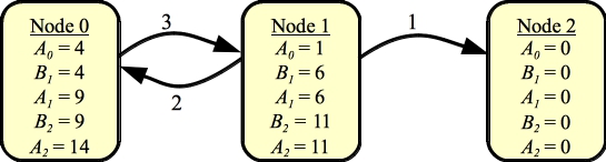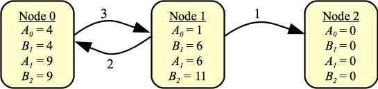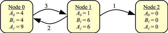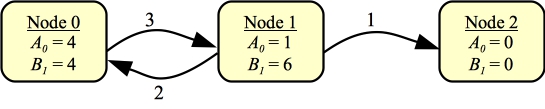 Next, I'm going to calculate B1 for each of the nodes. This is the shortest path that Alice can take if Bob gets to choose the edge out of each of these nodes. Since nodes 0 and 2 have at most one edge coming out of them, for them, B1 equals A0. However, with Node 1, Bob has a choice. If he chooses the edge to node 2, then the path length is one. However, if he chooses the edge to node 0, then the path length is (2 + A0(0)) = 6. Obviously, Bob will choose that edge. Here are the B1 values: