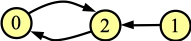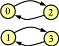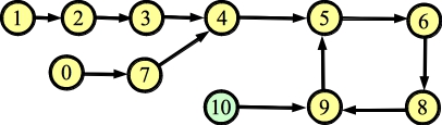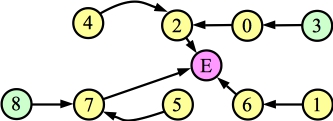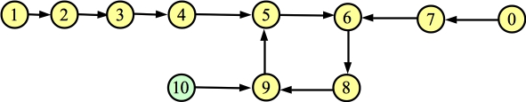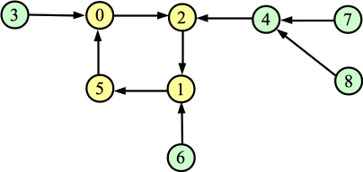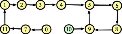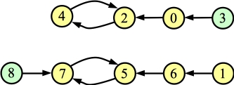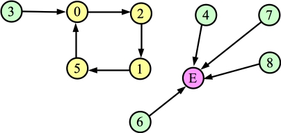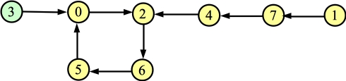 UNIX> a.out 7 Node 0: Useful: 3 InCycle: 1 Node 1: Useful: 2 InCycle: 0 Node 2: Useful: 3 InCycle: 1 Node 3: Useful: 0 InCycle: 0 Node 4: Useful: 2 InCycle: 0 Node 5: Useful: 3 InCycle: 1 Node 6: Useful: 3 InCycle: 1 Node 7: Useful: 2 InCycle: 0 #Useful: 1 0 3 4 242 UNIX> a.out 1 | tail -n 2 #Useful: 0 0 1 2 7 UNIX>Obviously, you can solve the case where node 1 is in the cycle, and node 0 isn't, very similarly. Example 8 is like example 7, but with nodes 0 and 1 switched: