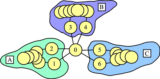 This graph has a lot of nodes and edges, but the ones that we care about are the ones connected to node 0. If you remove node zero from the graph, there will be three connected components in the graph, which I've labeled A, B, and C.