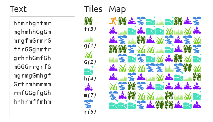 Each tile has a symbol (e.g., a forest has "f", river has "r") and can be assigned a specific cost, i.e., forest has a cost of 3 and river has a cost of 5.